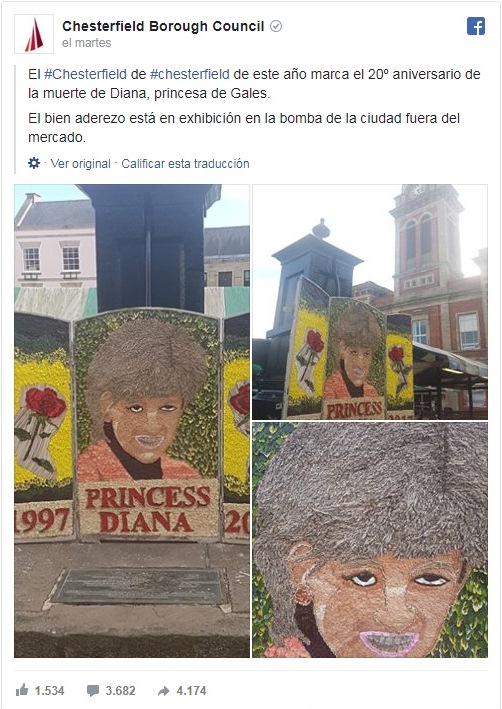 La obra en cuestión es un retrato de Lady Di revelado por la red social el pasado 12 de septiembre en la página oficial del Consejo de la ciudad británica de Chesterfield. Fue realizada por 14 voluntarios siguiendo la tradicional técnica de retratos de flores (‘well dressing’, en inglés), informa ‘The Independent’. La instantáneas pronto han causado una ola de comentarios indignados de los usuarios.