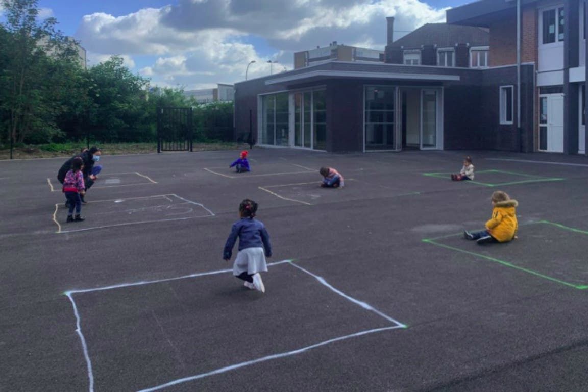 Tras la vuelta a clases en Francia, una imagen refleja cómo juegan los niños mientras cumplen con el distanciamiento social.