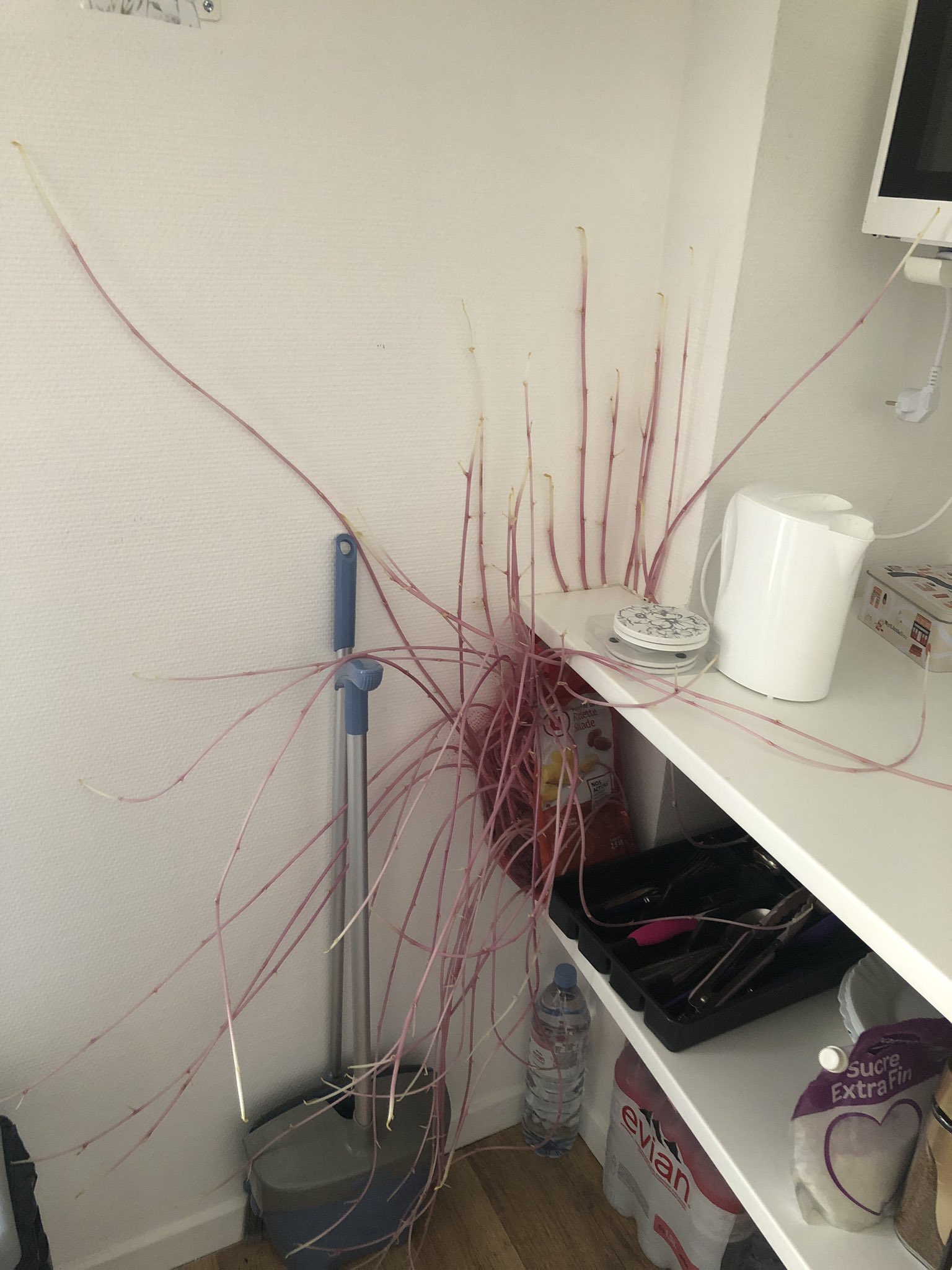 La bolsa estaba ubicada cerca de la ventana. Esto provocó que mientras estuvo fuera de su casa, las papas germinaran y tuvieran unas raíces tan amplias que taparon una parte de la pared de su casa.