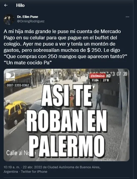 "Le digo: ‘¿Qué comprás con 250 mangos que aparecen tanto?’ (y ella le respondió), ‘un matecocido pa’", reveló finalmente el tuitero, quien compartió esta anécdota en su cuenta de Twitter y recibió hasta el momento más de 62 mil "me gustas" y cientos de comentarios de otros usuarios que dieron su punto de vista sobre el precio de la infusión que compraba la hija del autor del tuit viral.