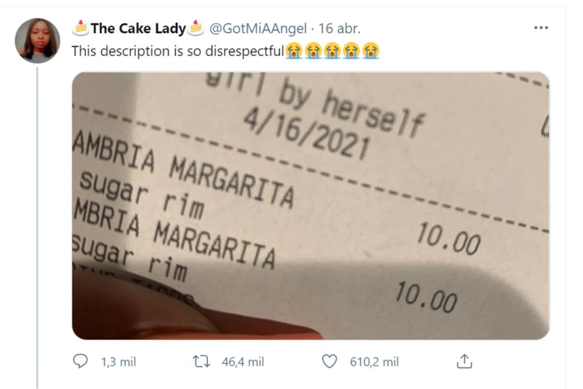La mujer, identificada como @GotMiAAngel, acusó a un mozo por referirse a ella como “la chica sola” en el ticket de la compra de los tragos que consumió en el local gastronómico.