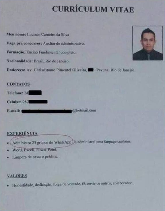 Es que en su CV, en el ítem “Experiencia laboral”, el chico de Río de Janeiro puso como una de sus cualidades ser administrador de “23 grupos de WhatsApp” y que además, ocupaba el mismo cargo en una “Fanpage de Facebook”.