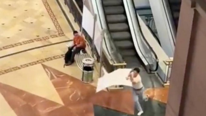 Según el video que registró un visitante del centro comercial, el fanático decidió llevarse el cartel de recuerdo: lo tomó, sin importar su tamaño, y emprendió la fuga por las escaleras mecánicas, mientras un empleado del lugar salió corriendo detrás generando diversas reacciones en los presentes.
