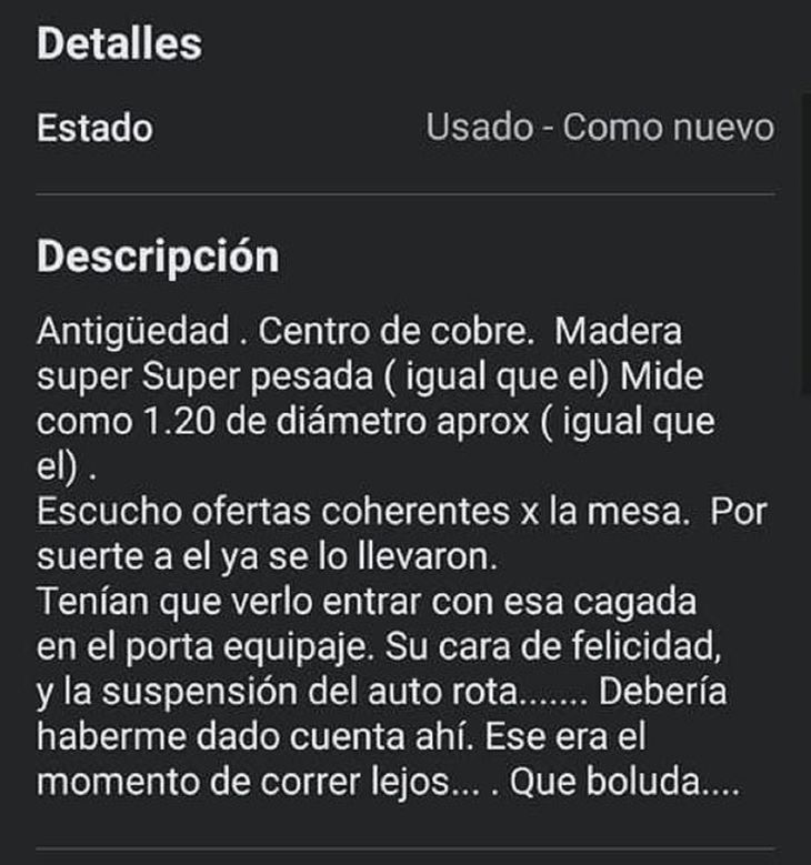 Así, ofreció una mesa "súper pesada (igual que él) Mide como 1.20 de diámetro aprox (igual que él)" y agregó: "Escucho ofertas coherentes x la mesa. Por suerte a él ya se lo llevaron".