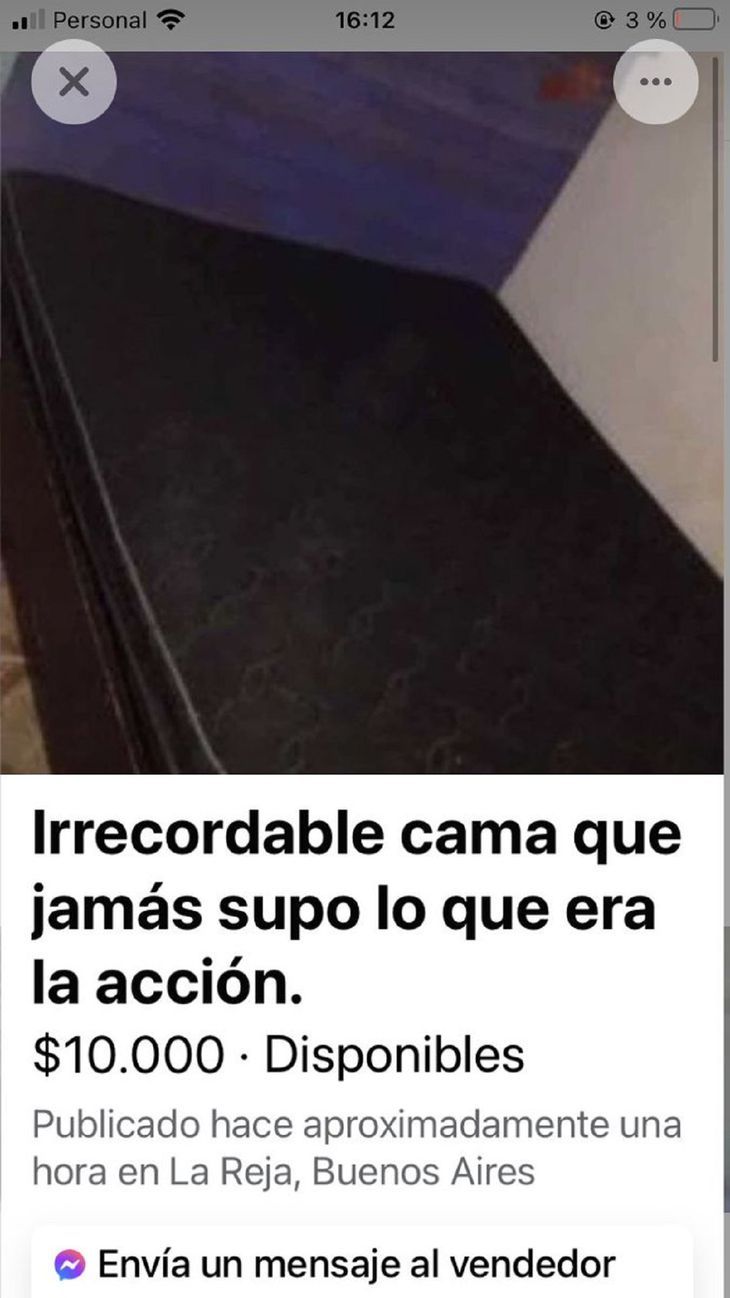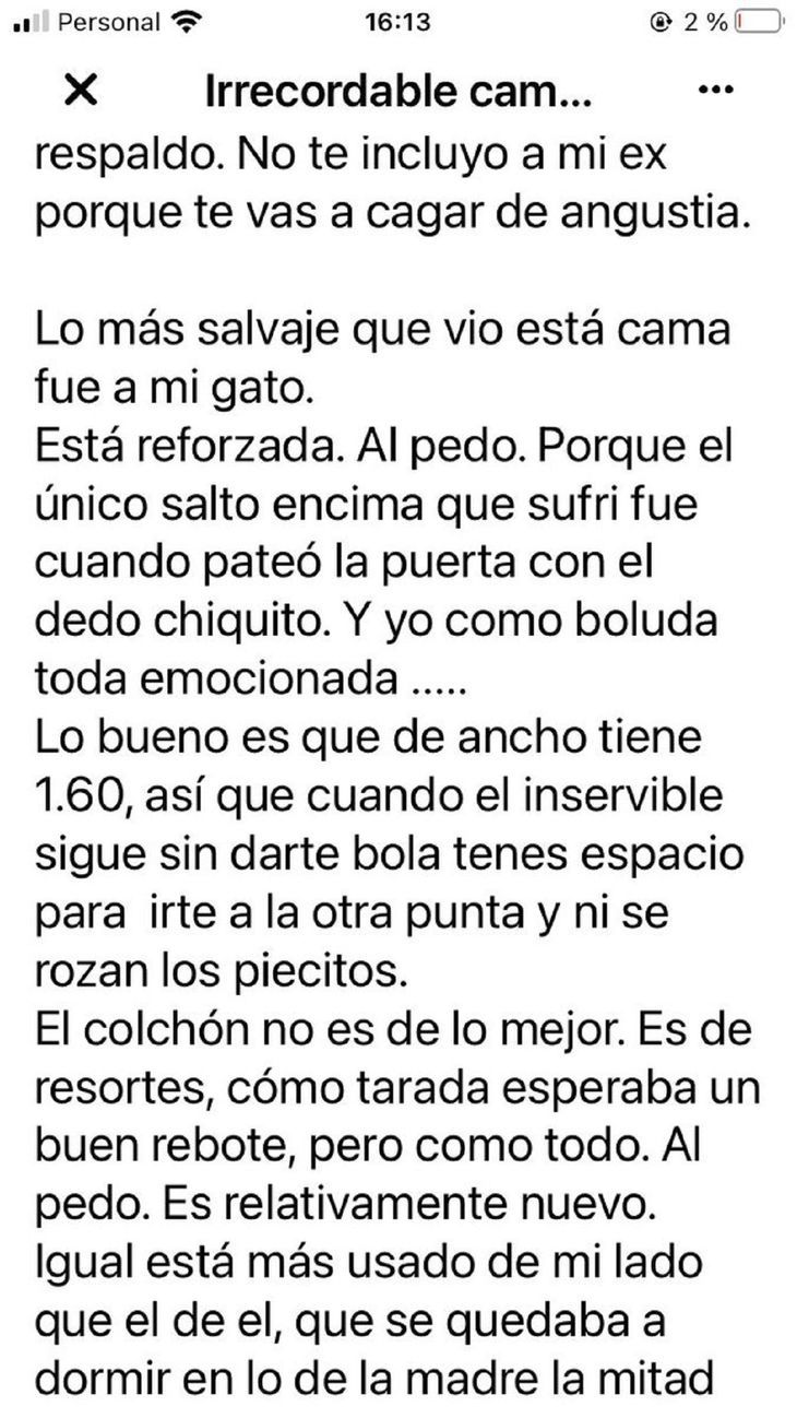 Pero el post más picante es el de al "irrecordable cama que jamás supo lo que era la acción". Luego dijo: "No te incluyo a mi ex. Lo más salvaje que vio esta cama fue a mi gato. Está reforzada. Al pedo, porque el único salto encima que sufrí fue cuando pateó la puerta con el dedo chiquito. Y yo como boluda toda emocionada".