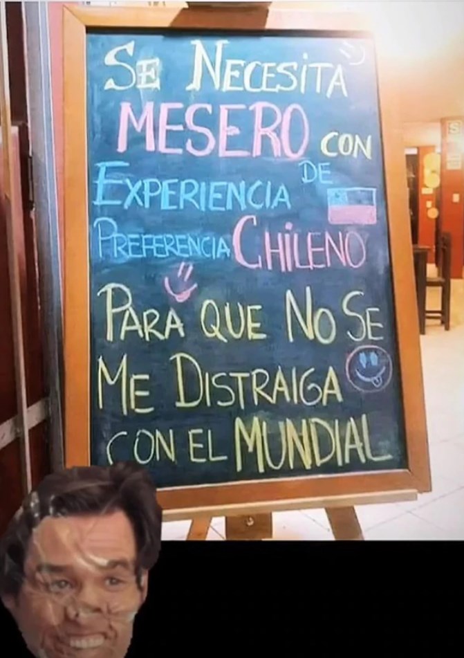 "Se necesita mesero con experiencia. De preferencia, chileno, para que no se me distraiga con el Mundial", la elocuente frase que apareció en una pizarra y que se viralizó por las redes sociales. La modelo acompañó la imagen con una cara animada de Jim Carrey.