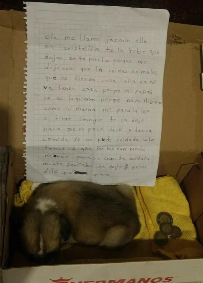 "Hola, me llamo Jazmín, ella es Cristalita. Te la tuve que dejar en tu puerta porque me dijeron que tú cuidas animales que no tienen casa, y ella ya no va a tener casa porque mis papás no la quieren porque no es original. Como mi mamá y mi papá la iban a tirar, mejor te la dejo para que no pase frío y tenga comida. Yo no pude cuidarla, solo tengo 7 años y no me dan mucho recreo para su comida. Cuídala mucho por favor, te dejo 8 pesos. Dile que la quiero", escribió la nena, en una carta que dejó junto a la perrita en la puerta de su vecina.