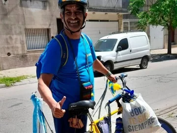 Darío Chaile es peluquero, oriundo de la ciudad de La Plata, y partió desde su casa de Gonnet el miércoles 25 de octubre a bordo de "La romántica", una bicicleta ploteada con los colores azul y oro.
