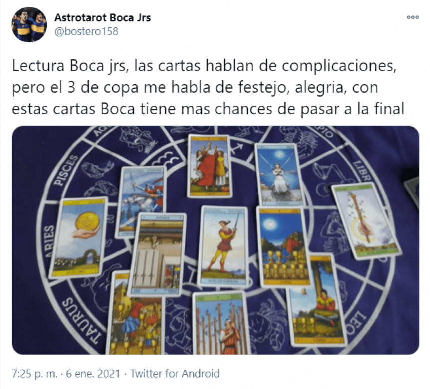 "Lectura Boca Jrs, las cartas hablan de complicaciones, pero el 3 de copa me habla de festejo, alegría, con estas cartas Boca tiene mas chances de pasar a la final", twitteo el tarotista xeneize el pasado 6 de enero, día en el que se jugó el partido de ida en La Bombonera, que terminó 0-0.