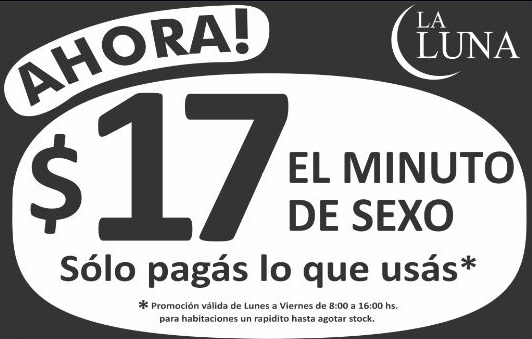 El conocido telo mendocino La Luna llegó nuevamente a los medios nacionales por una de sus llamativas promociones que son anunciadas en la vía pública. En esta ocasión la publicidad que llamó la atención es la que cobra a $17 el minuto en sus instalaciones.