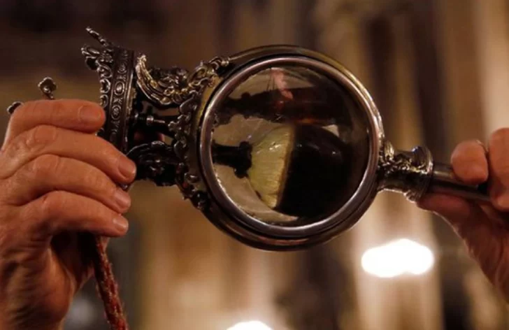 Durante el mismo, el obispo Vincenzo De Gregorio alza entre sus manos el recipiente, guardado en la capilla de San Genaro. El líquido que contiene se encuentra en estado sólido. Sin embargo, cuando De Gregorio lo agita, la sangre se licúa. Los feligreses, entonces, pueden ver como el milagro ocurre delante de sus ojos.