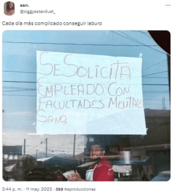“Se solicita empleado con facultades mentales sano”, destacaba la búsqueda laboral con la que se topó la usuaria "ziggysstardust_" en su cuenta de Twitter y manifestó que “cada día es más complicado conseguir laburo”.