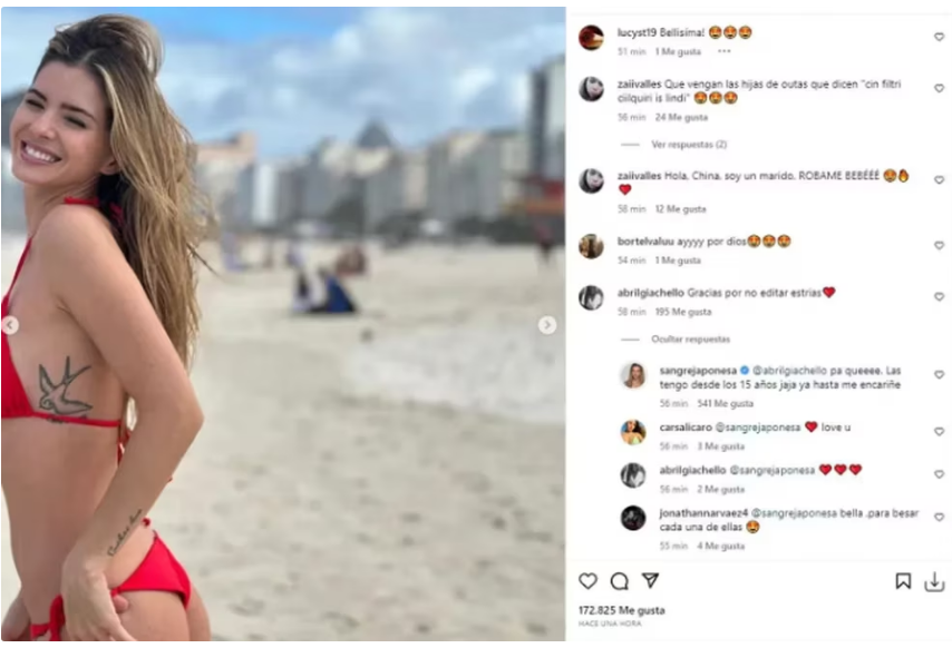La joven en cuestión escribió junto a un emoji de un corazón rojo: “Gracias por no editarlas”. Estas palabras no pasaron desapercibidas para la actriz que le contestó en su mismo posteo: “Pa queee. Las tengo desde los 15 años, jaja ya hasta me encariñé”. Acto seguido, se sumaron los comentarios de muchos seguidores defendiendo a la China, aunque ella ya se había encargado de desactivar el tema dando su opinión al respecto.