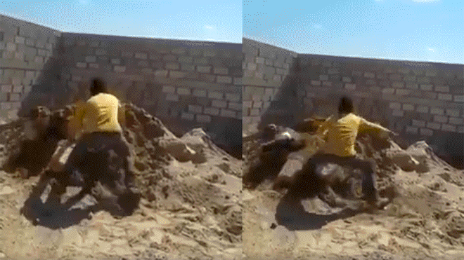El hombre que estaba trabajando como todos los días, fue asustado por uno de sus compañeros en el momento en el que se acercó a una montaña de arena. Previo a pegarse un tremendo susto, el empleado se encontraba con un balde en una de sus manos el cual pretendía llenarlo de material.