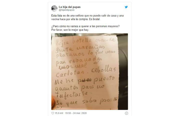 “Esta lista es de una señora que no puede salir de casa y una vecina hace por ella la compra. Es brutal”, señala una usuaria de Twitter. Luego de nombrar los víveres que necesita, la abuela terminó la nota con una aclaración: “Me he puesto guantes para no infectarte. Lo que sobre para ti. Te quiero mucho. No he tocado el dinero”, lo que enterneció a todos.