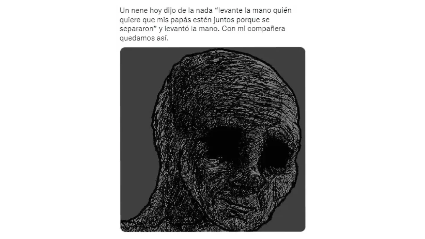Luego de sus palabras, el menor de edad quedó solo con la mano levantada. Como era de esperar, este momento dejó sorprendida a la maestra, quien agregó: “Con mi compañera nos quedamos así”. Al final del tweet, agregó un meme que describió perfectamente cómo se sintieron al escuchar las palabras del nene, quien no atraviesa un buen momento por la separación de sus padres.