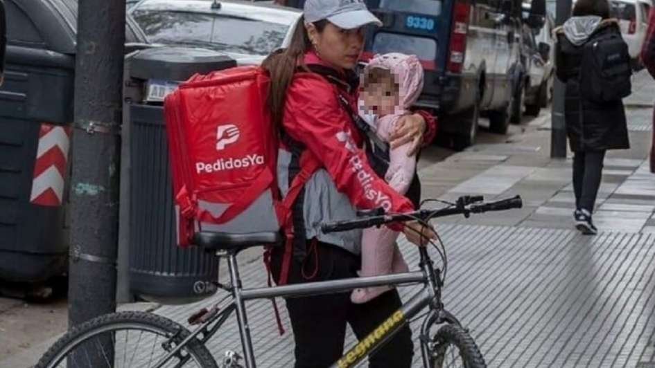 Según consignó Reverso, la foto de una mujer cargando a su bebé junto a una bicicleta, vestida con el uniforme de una empresa de repartos, incluida una mochila en la espalda, circula en redes sociales desde el 3 de octubre último.