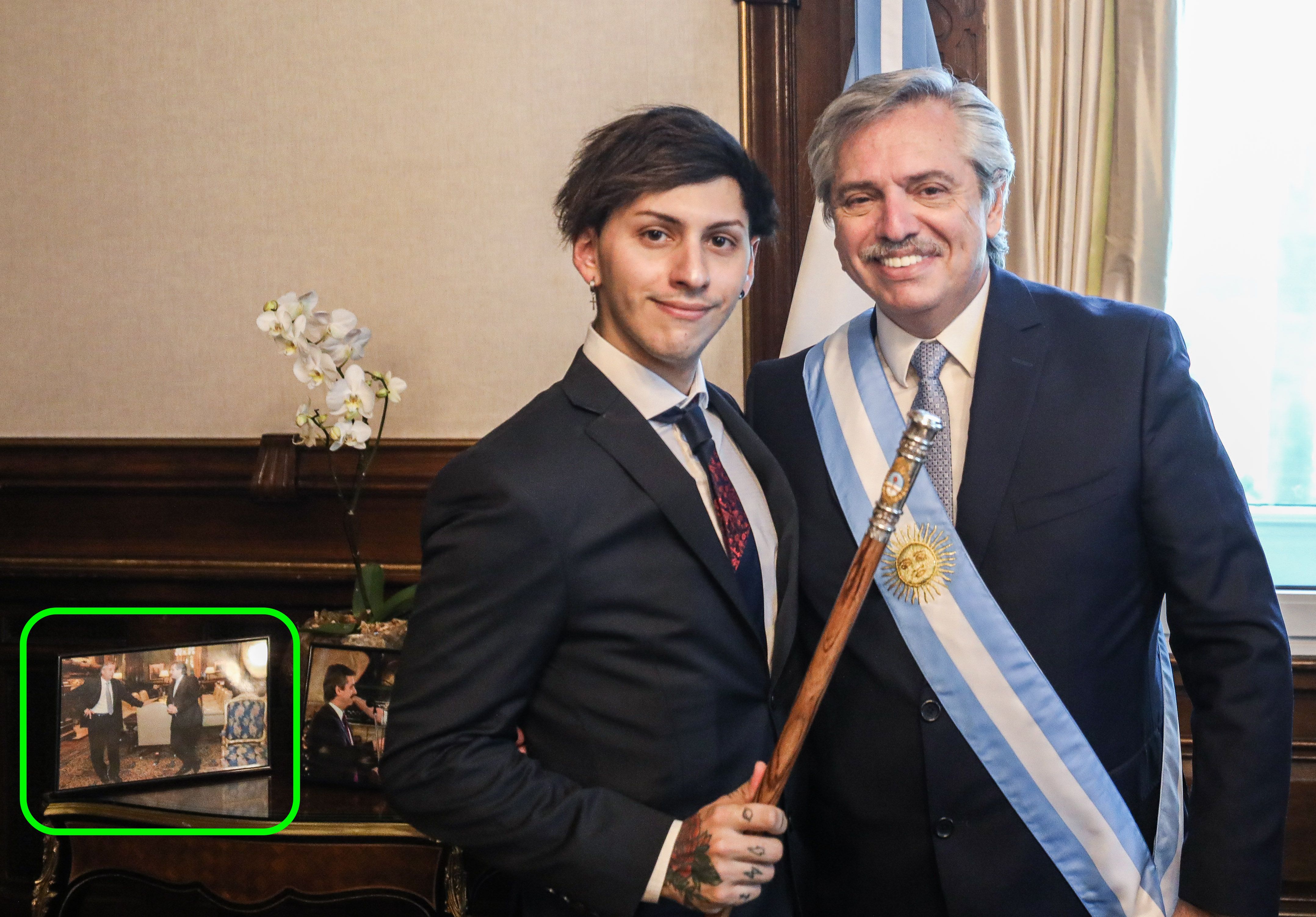 Alberto Fernández eligió para tener cerca de su escritorio de trabajo en su despacho de la Casa Rosada dos fotografías que le recuerdan momentos de su gestión como Jefe de Gabinete del kirchnerismo: una conversando distendidamente con Néstor Kirchner en ese mismo recinto y otra que refleja una visita que hizo a la sede gubernamental el célebre músico Luis Alberto "El Flaco" Spinetta.