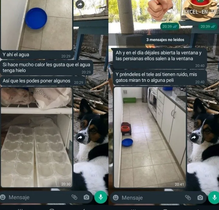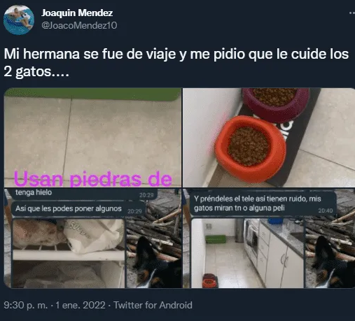 "Mi hermana se fue de viaje y me pidió que le cuide los dos gatos", escribió el usuario @JoacoMendez10 junto a cuatro capturas de un chat en WhatsApp que tuvo con su hermana Paloma. Allí la joven le detalló los cuidados que Joaquín tenía que seguir al pie de la letra para que los gatos estuvieran bien.