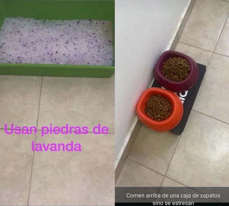El primer pedido de Paloma para su hermano Joaquión fue en cuanto a su cajita de piedritas para ir al baño: "Usan piedras de lavanda". A esto se le sumó una aclaración importante a la hora de alimentarlos: "Comen arriba de una caja de zapatos, sino se estresan". Ante estas dos indicaciones, la joven compartió dos fotos que ilustran cómo deben realizarse las dos acciones.