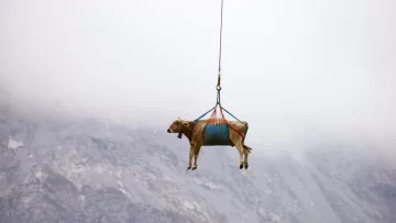 Sin embargo, los animales están expuestos a distintos peligros y, en ocasiones, sufren lesiones que limitan su movilidad, por lo que este año aquellas vacas que no estuvieron en condiciones de emprender la caminata de vuelta a casa fueron aseguradas a la parte inferior del helicóptero y transportadas a las tierras bajas cercanas al paso Klausen.