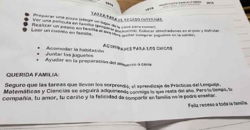 Previo a las vacaciones de invierno, una docente bonaerense dio unas simpáticas indicaciones para que sus alumnos no se aburran y ayuden en casa.