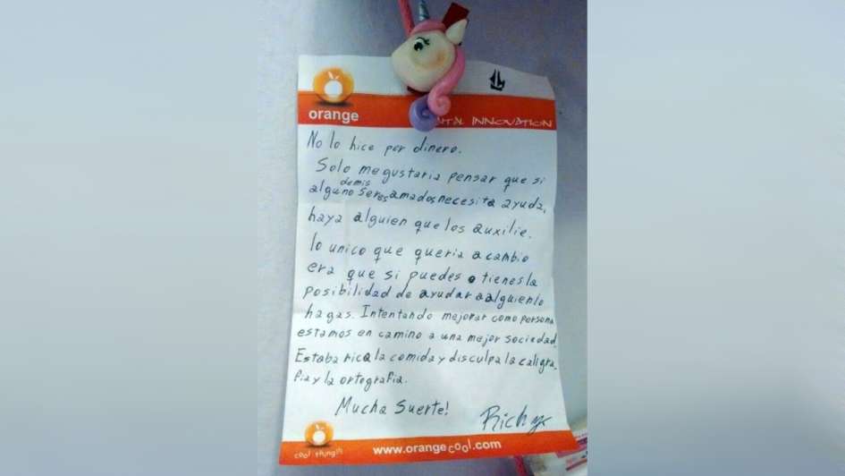“No lo hice por dinero. Sólo me gustaría pensar que si alguno de mis seres amados necesitan ayuda haya alguien que los auxilie. Lo único que quería a cambio era que si puedes o tienes la posibilidad de ayudar a alguien lo hagas. Intentando mejorar como personas estamos en camino a una mejor sociedad. Estaba rica la comida y disculpá la caligrafía y ortografía.