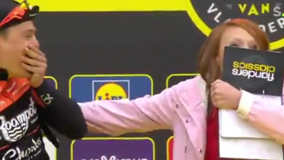 Una periodista de televisión belga protagonizó tremendo blooper cuando, en medio de una nota, besó accidentalmente a un ciclista que entrevistaba.