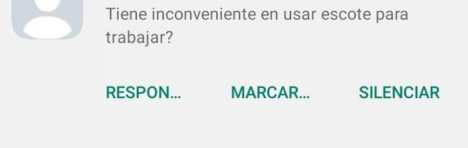 Sin embargo, a la otra persona pareció no impórtale las razones que dio la mujer ya que en una segunda captura se puede ver que volvió a enfocarse en el aspecto físico. “¿Tiene inconveniente en usar escote para trabajar?”, consultó.