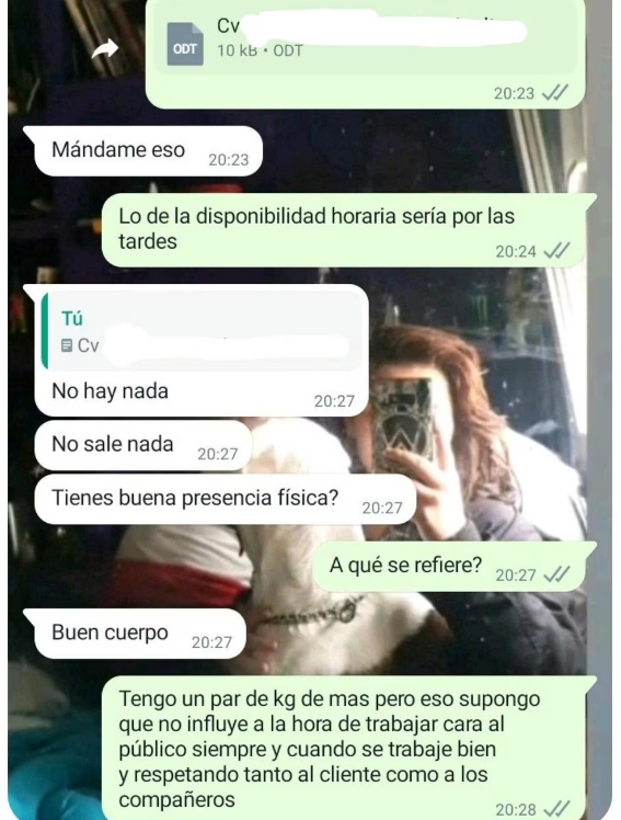 La joven le mandó su curriculum vitae, pero la persona de la cafetería se quejó porque en el documento “no se veía nada”. Ocurre que la persona detrás del teléfono quería ver si la postulante tenía “buen cuerpo”.