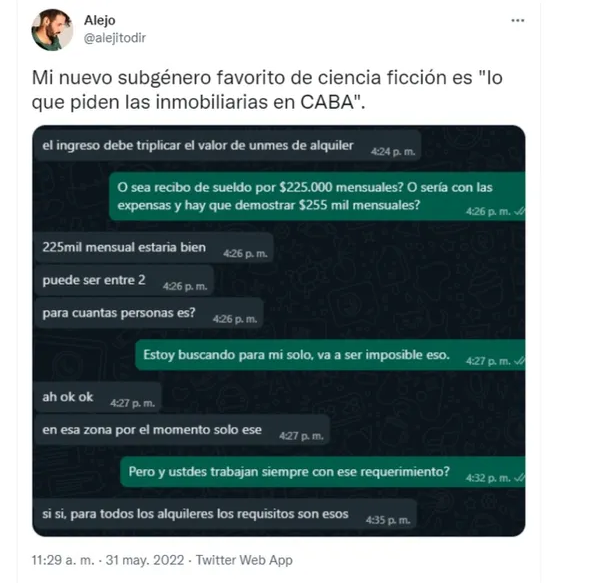 La compleja realidad que viven los argentinos y, particularmente, los vecinos de la Ciudad de Buenos Aires para conseguir un departamento en alquiler se reflejó en un tuit que se hizo viral en los últimos días. “Mi nuevo subgénero favorito de ciencia ficción es ‘lo que piden las inmobiliarias en CABA’”, escribió un usuario a modo de queja y compartió una conversación en la que le pidieron un recibo de sueldo de $225.000 por mes.