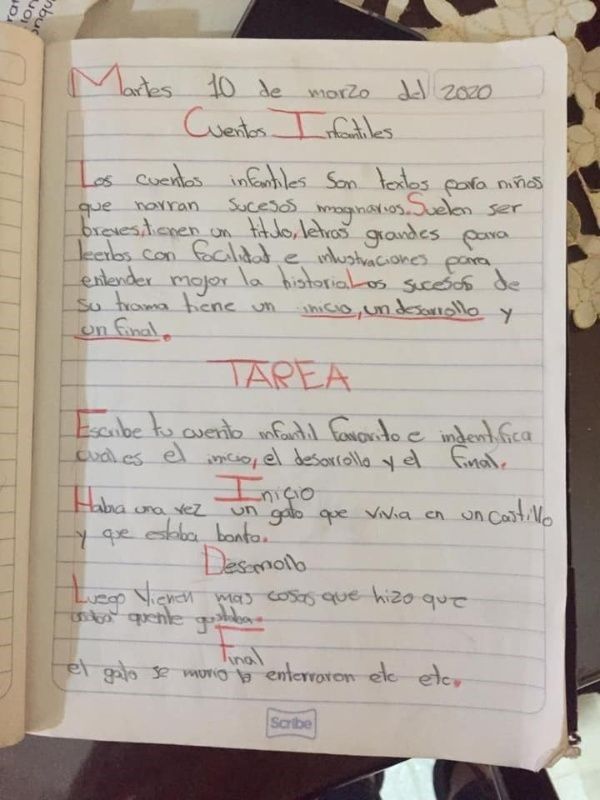 El hombre, llamado Miguel, se encontraba entonces en una junta de trabajo: por eso, tardó en responder. La nena insistió, envió emoticones y súplicas, hasta que él accedió. Tardó un tiempo en entender la caligrafía de su hija y la consigna, pero finalmente se dispuso a ayudarla. Primero le preguntó “¿cuál es tu cuento favorito?”. “El gato con botas”, respondió ella.