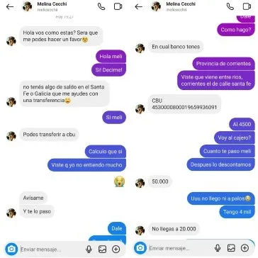 Desde la cuenta de Cecchi, inició la conversación. “Será que me podés hacer un favor”, decía junto a un emoji con lágrimas en los ojos. Ante la respuesta afirmativa de la autora del tuit, el “caco”, como lo llamó, le preguntó si tenía saldo en algún banco para ayudarla con una transferencia.