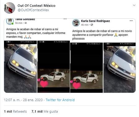 Las capturas de ambas publicaciones fueron compartidas en el perfil de ‘Out of Context México’. “Amigos le acaban de robar el carro a mi esposo, x favor compartan, cualquier informe manden msj”, decía uno de los mensajes. Mientras que el otro rezaba: “Amigos le acaban de robar el carro a mi novio ayúdenme a compartir por favo apoyen plissssss”.