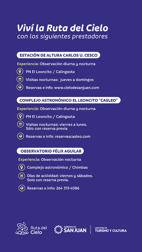 Desde el Observatorio Astronómico Félix Aguilar invitaron a quienes quieran acercarse a sus espacios a ver el fenómeno. Ya sea, en la sede Central en Chimbas, los días viernes y sábados, con reservas al 2643194086; o en la Estación de Altura Carlos Cesco en Barreal, de jueves a domingos, con reservas en www.cielodesanjuan.com