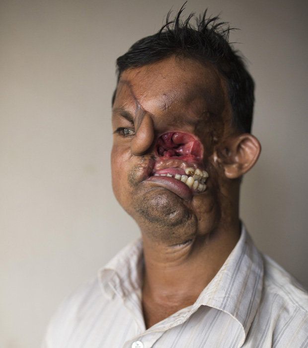 Súbitamente, sin esperarlo, un tigre (sí, un tigre) saltó sobre él y comenzó a atacarlo. Salvó su vida de milagro. Sin dudas. Pero la mitad de su rostro, golpeado una y otra vez por las garras del salvaje animal, quedó desfigurada.