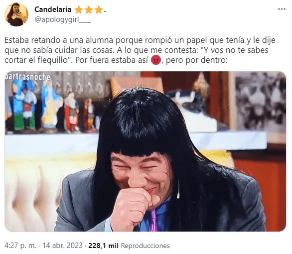 "Estaba retando a una alumna porque rompió un papel que tenía y le dije que no sabía cuidar las cosas", indicó al comienzo de su publicación ‘Candelaria’ (@apologygirl____), quien quiso que sus seguidores de la red social del pajarito sepan del momento desopilante.
