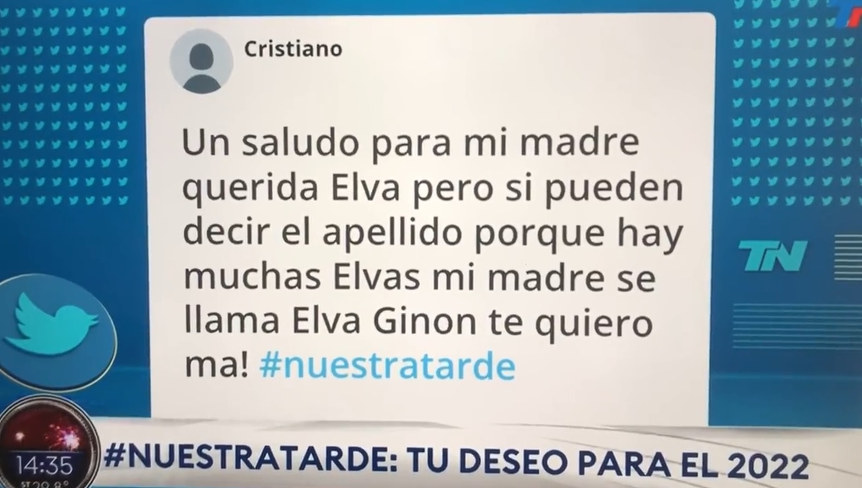 En ese instante, colocan en pantalla el siguiente mensaje: "Un saludo para mi querida madre Elva pero si pueden decir el apellido porque hay muchas Elvas mi madre se llama Elva Ginon te quiero ma!", rezaba textualmente el mensaje que podía verse en cámaras con el hashtag solicitado por la producción.
