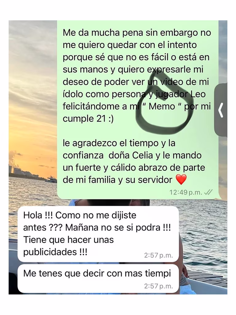 La situación se volvió viral gracias a que el usuario compartió en sus redes sociales cómo fue el diálogo con la mamá de Messi para conseguir que el futbolista de la Selección le enviara un saludo por el día de su cumpleaños. “Me da mucha pena, sin embargo no me quiero quedar con el intento porque sé que no es fácil o está en sus manos y quiero expresarle mi deseo de poder ver un video de mi ídolo como persona y jugador, Leo, felicitándome a mí, ‘Memo’, por por mi cumple 21. Le agradezco el tiempo y la confianza Doña Celia y le mando un fuerte abrazo de parte de mi familia y su servidor”, escribió el joven en un mensaje de WhatsApp a la madre de La Pulga.