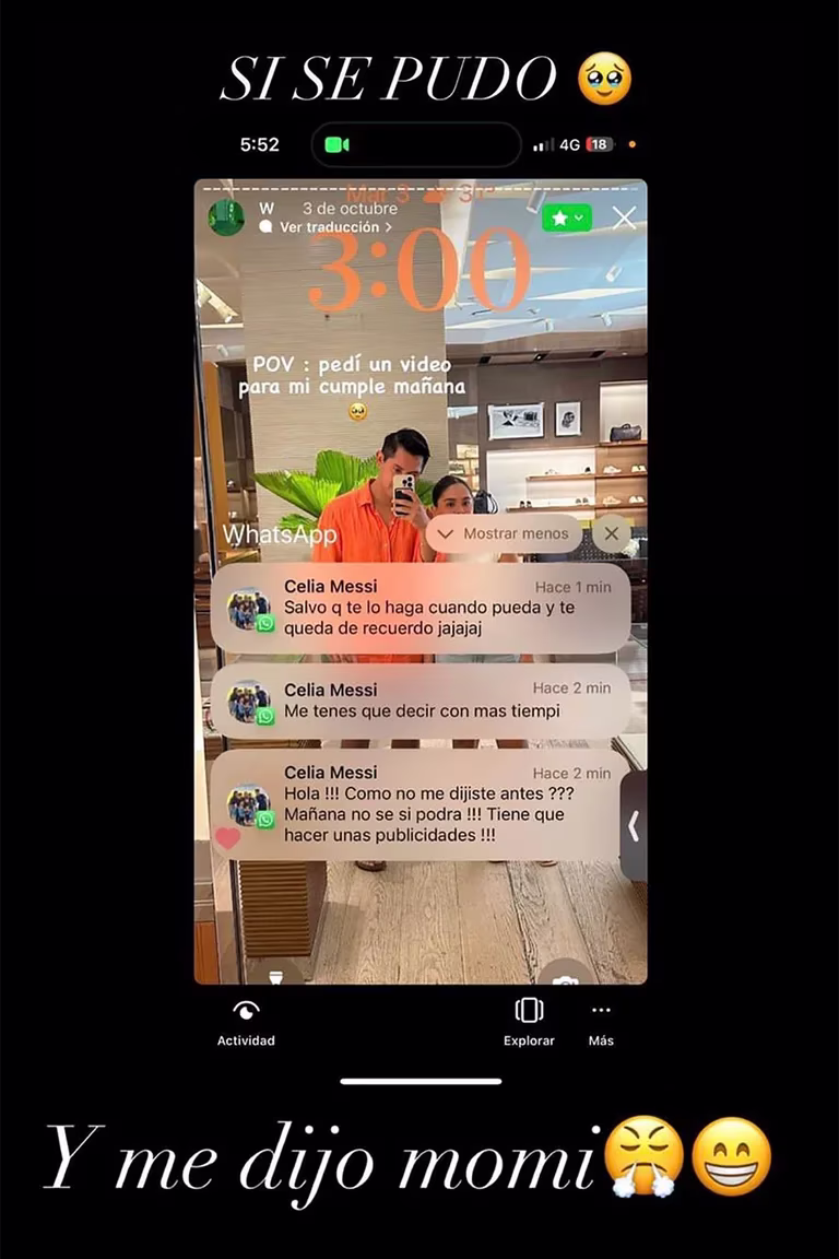 El cumpleañero decidió hacer viral el error que cometió el futbolista al confundir su nombre (Momi en lugar de Memo) con el video y las capturas de pantalla correspondientes y dos emojis que dan cuenta de la mezcla de frustración y alegría por el gesto del siete veces ganador del Balón de Oro.