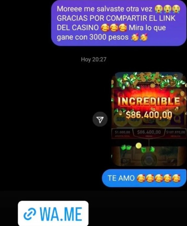 La captura de pantalla en cuestión muestra un chat donde Rial se agradece a sí misma por haber ganado dinero en el casino digital que promociona: "More me salvaste otra vez. Gracias por compartir el link del casino. Mirá lo que gané con tres mil pesos", posteó en su historia de Instagram. Este hecho no pasó desapercibido para los usuarios de las redes sociales, quienes rápidamente acusaron a la hija de Jorge Rial de realizar publicidad engañosa.