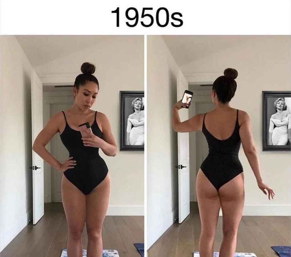 En los años 50, el ideal de belleza era el cuerpo "reloj de arena". La Elizabeth Taylor con curvas arriba y abajo era uno de sus íconos. En esos tiempos se vendían pastillas para que las mujeres ganen peso. En aquellos años, además, fueron creadas la revista Playboy y la muñeca Barbie.