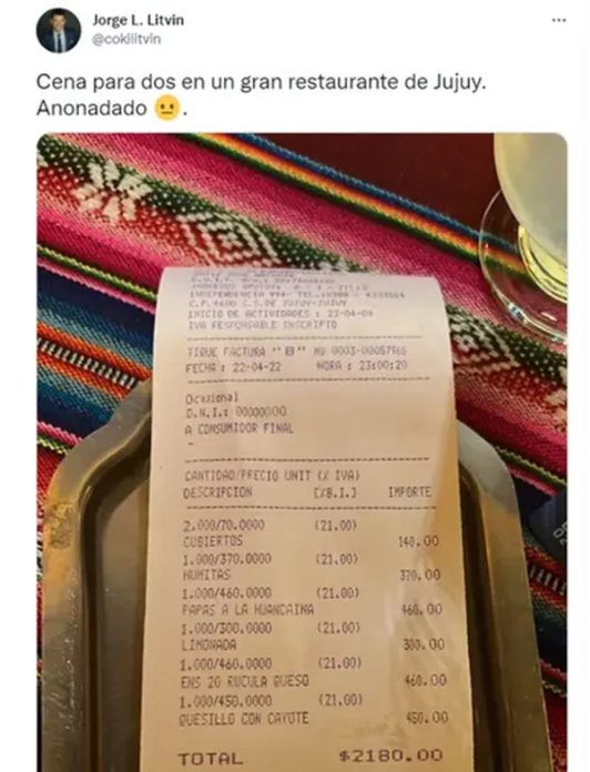 “Cena para dos en un gran restaurante de Jujuy. Anonadado”, escribió el usuario identificado como Jorge Litvin – @cokilitvin – en Twitter, sin hacer hasta ahí ninguna referencia sobre si su publicación era una queja por los precios o una sorpresa por el gasto.