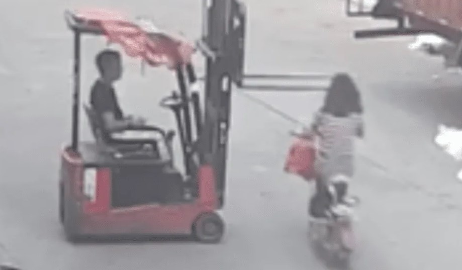 En la grabación, se observa al operario a bordo de la maquinaria, detenido en medio del camino mientras revisaba su celular. De pronto, aparece una mujer quien a pesar de tener frente a si los brazos del montacargas no detiene su andar y recibe un tremendo golpe en la cabeza que la tira de su vehículo y lanza por los aires sus pertenencias.