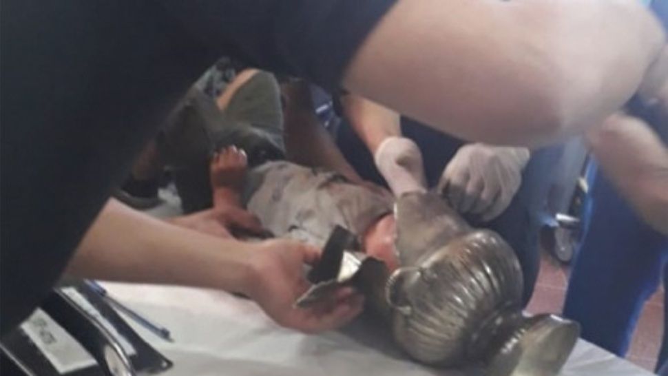 Un nene de dos años arribó al Hospital Dr. Horacio Heller de Neuquén con una vasija metálica atorada en la cabeza. El insólito hecho sorprendió al personal de salud, que trabajó en conjunto de cinco efectivos del Cuartel de Bomberos Gregorio Álvarez, quienes lograron extraer el objeto.