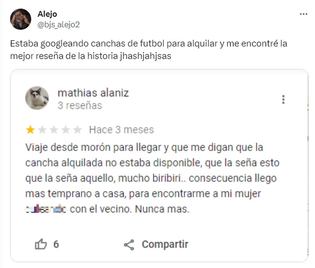 “Estaba googleando canchas de fútbol para alquilar y me encontré la mejor reseña de la historia jajajaja”, escribió en su perfil de X, la red social antes conocida como Twitter.
