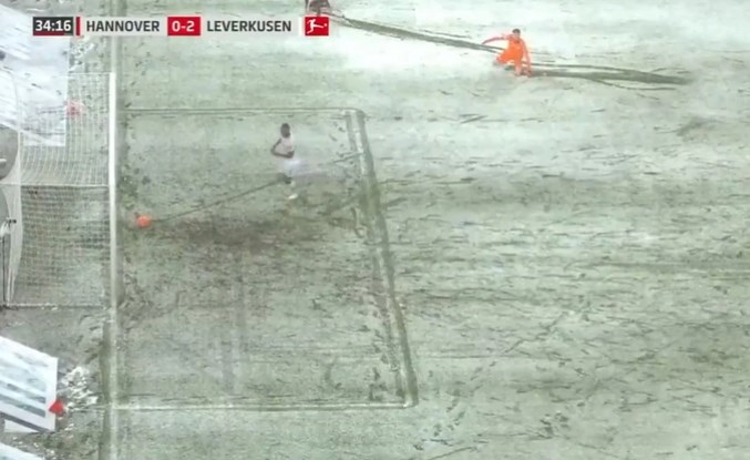 Tras un despeje largo del arquero Michael Esser, la defensa del Bayer Leverkusen falló y la pelota le quedó a Genki Haraguchi. El japonés eludió al portero rival y definió al gol, con todo el arco a su disposición. Fue en ese momento cuando el clima jugó un papel determinante: la gran cantidad de nieve acumulada en el campo de juego frenó el balón sobre la líneae impidió la conquista del Hannover.