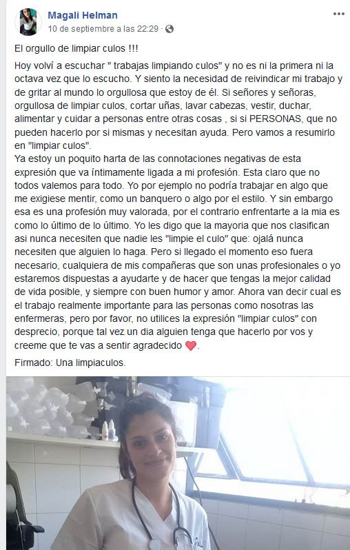 Magali Helman trabaja como enfermera, pero un día de cansó de los comentarios despectivos que recibía sobre sus tareas habituales y decidió expresar en su perfil de Facebook el orgullo que siente por su profesión.