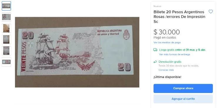 Si el lector ingresa en la aplicación Mercado Libre, podrá encontrar decenas de publicaciones de diversos billetes de todas las nominaciones a precios muy superiores a su propio valor.