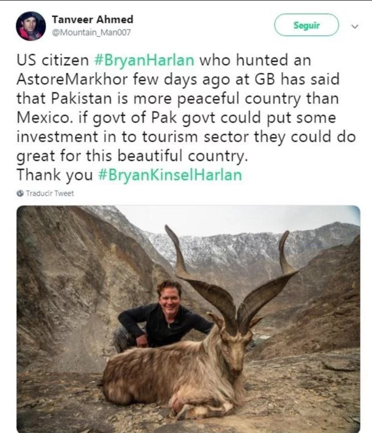 Bryan Kinsel Harlan, de Texas, quedó en el ojo de la tormenta tras matar a una cabra montesa de la especie Astor Markhor, que está en peligro de extinción. El hombre tuvo que pagar 110 mil dólares para que las autoridades de Pakistán le permitieran cazar en la región del Himalaya.